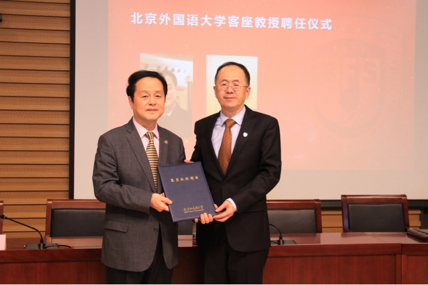 11月27日下午,我校在图书馆五层会议厅举行客座教授聘任仪式。原驻波黑大使王辅国,原驻密克罗尼西亚、冰岛大使张卫东受聘为我校客座教授,党委常委、副校长贾文键为王辅国、张卫东颁发了客座教授聘书。