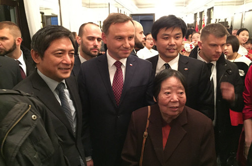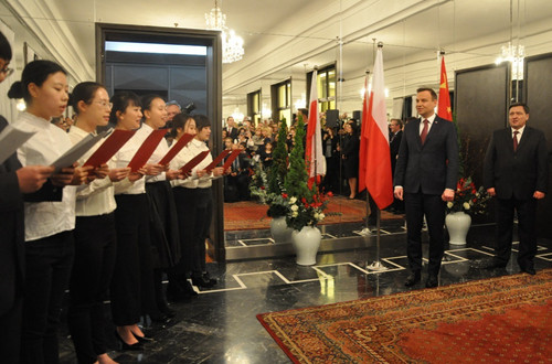 我校波兰语专业2014级学生为总统和在场嘉宾演唱了两首波兰歌曲,受到了总统和来宾们的热烈欢迎。杜达总统亲自与每一位同学握手并表示祝贺。波兰驻华大 使特别向杜达总统介绍了我校波兰语专业易丽君教授的贡献和成就。杜达总统向易教授表示敬意,感谢她为中波两国交流所作出的重要贡献。