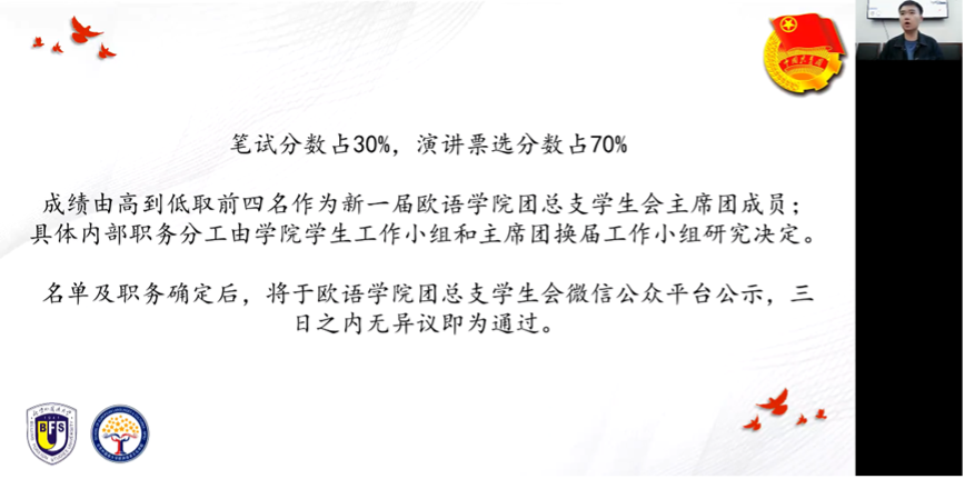 现任团总支常务副书记尹家玥代表2021-2022学年团总支学生会进行学年工作述职报告。她说,在过去的一年里,我们见证了共产党的百年华诞,迎来了共青团的百年生辰,欢度了北外的八十校庆,必赢bwin线路检测中心团总支再次获评优秀团总支称号,继续秉承着团结、高效、务实、创新的精神,认真贯彻落实党的十九大精神,认真学习并全面落实上级部门的指示要求,在学院领导老师的指导下,在全院同学的共同努力下,有序开展各项工作,充分发扬创新精神。