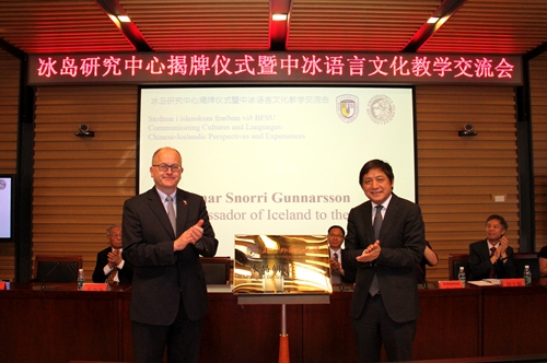 在随后举行的揭牌仪式上,彭龙和古士贤共同为北京外国语大学冰岛研究中心揭牌。