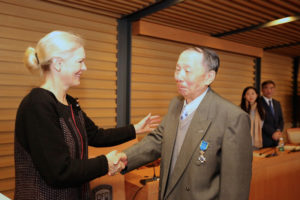 授勋仪式上,林戴安大使将北极星勋章挂到两位教授胸前,并向他们颁发了由瑞典国王卡尔十六世·古斯塔夫亲笔签名的证书。瑞典语班学生演唱圣诞歌曲,向两位前辈表示祝贺。