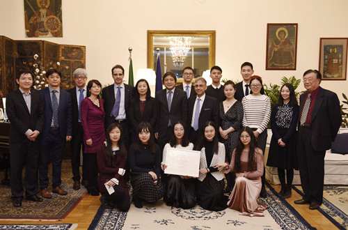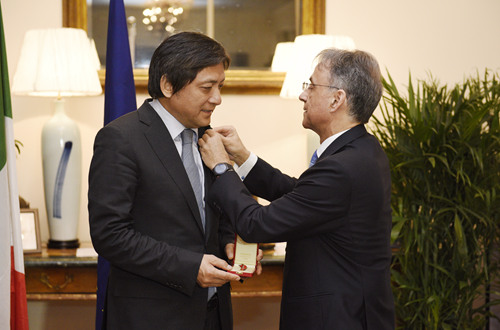 3月8日晚,意大利共和国驻华大使馆举行授勋仪式,意大利驻华大使谢国谊代表意大利总统塞尔焦•马塔雷拉授予我校校长彭龙意大利之星将领勋章。