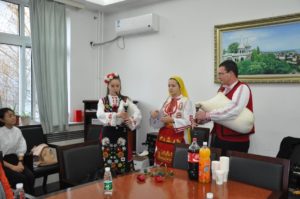 当三位乐队成员身着红白相间的民族服装走入联欢会场地时,同样穿着精美的保加利亚服饰的2014级保语学生林宇翔唱起了欢快的《一支保加利亚玫瑰》,来表达对客人的欢迎。