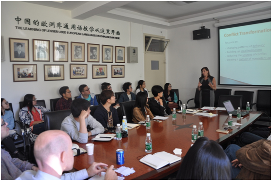 12日上午的讲座题目为“冲突及其解决办法”,邦妮为主讲人,托马斯对其所讲内容进行解释和补充。邦妮的授课深入浅出,方式丰富多样。通过小实验来引导大家看到差异存在的必然性,从而理解不同类型冲突的来源。此外,通过角色扮演、情景模拟等方式寻求冲突的解决。最后,邦妮总结出了冲突解决的几种类型,并通过解答测试题的形式让在场的参与者了解自己对危机处置类型的倾向性。