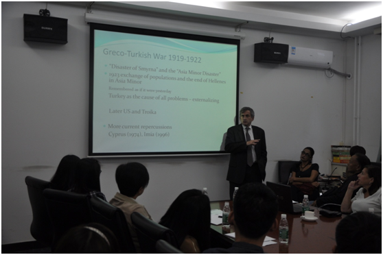 13日下午,托马斯和邦妮共同主讲“希腊及其现状”,内容涉及希腊的历史、文化和民族性等,深度剖析当前希腊经济危机产生的原因及影响,并对希腊未来的走向进行了分析预测。托马斯夫妇在希腊共度过了10年的时光,对希腊的了解深入、透彻。希腊语专业的同学们踊跃发言,积极提问,两位专家细致地解答每一个问题,并鼓励他们到希腊去了解当地的环境和文化。