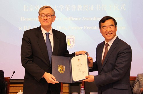 会后,图尔克前总统在图书馆五层报告厅参加北京外国语大学荣誉教授证书授予仪式。闫国华副校长代表学校向图尔克颁发荣誉教授证书。随后,图尔克发表了题为《多边主义未来》的演讲。