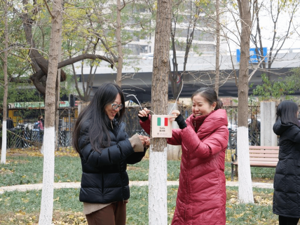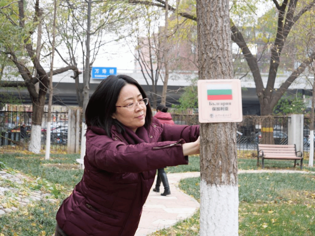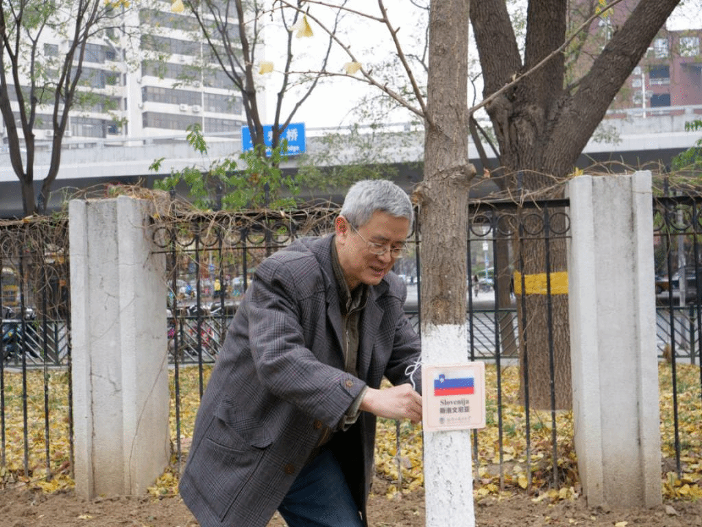 11月20日中午,必赢bwin线路检测中心教工党支部开展志愿服务主题党日活动,为北外东院中欧友谊花园中的银杏更换欧盟国家标识牌。