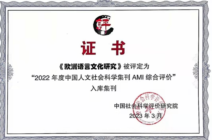 2023 年3月17日,第十届全国人文社会科学评价高峰论坛暨期刊评价报告发布会在京举办,会上发布了《中国人文社会科学期刊AMI综合评价报告(2022)》(以下简称《期刊报告》)和《中国人文社会科学学术集刊AMI综合评价报告(2022)》(以下简称《集刊报告》)。《期刊报告》基于学科与期刊特点构建了不同的期刊评价指标体系,对我国2168种人文社会科学期刊进行了评价。《集刊报告》是中国社会科学评价研究院第一次开展集刊评价工作所形成的成果,共有403种学术集刊参与了评价。评价结果于4月对参评单位正式公示,《欧洲语言文化研究》成功入选AMI入库集刊。