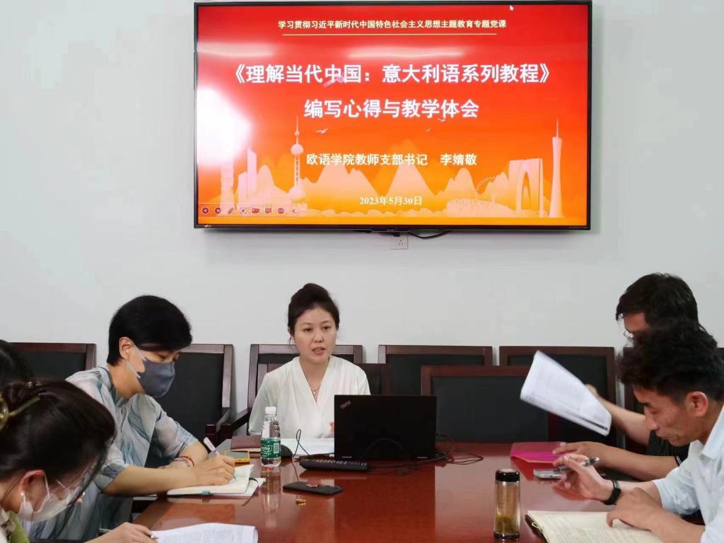 5月30日下午,必赢bwin线路检测中心教师党支部开展主题教育专题党课讲授活动。党支部书记李婧敬从《理解当代中国:意大利语系列教程》谈“学习党的二十大精神,讲好中国故事”的心得体会;意大利语教研室董丹、余丹妮两位专业老师配合党课讲授,分享《理解当代中国:意大利语系列教程》的编写心得与教学体会;与会党员教师围绕如何将《理解当代中国》教材编写和教学使用的经验,更加广泛运用到欧洲非通用语教材研发和教育教学之中展开了深入交流。