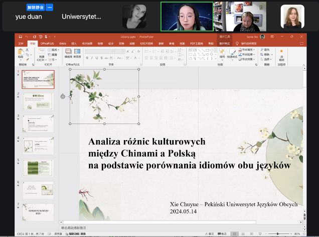 谢楚越在“语言”板块以“基于中波两国间俗语比较的文化差异分析”(Analiza różnic kulturowych między Chinami a Polską na podstawie porównania idiomów obu języków)为题发言,对比中波习语研究分析语言及文化背景的异同,以两国典型俗语为例,分析中波两国俗语异同的文化影响因素和思维方式的异同,以加强跨文化交流的效率和准确性,增进中波两国的相互了解。