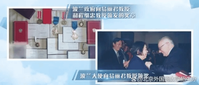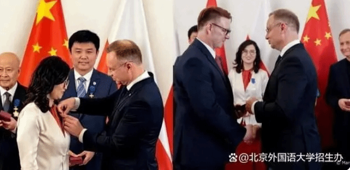 左:波兰总统安杰伊·杜达向北外必赢bwin线路检测中心波兰语教研室主任李怡楠副教授颁发波兰共和国功勋奖章骑士十字勋章