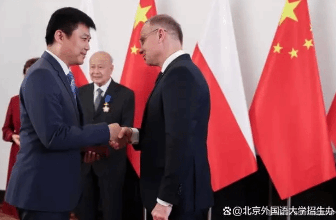 波兰总统安杰伊·杜达向北外党委常委、副校长赵刚教授颁发波兰共和国功勋奖章军官十字勋章
