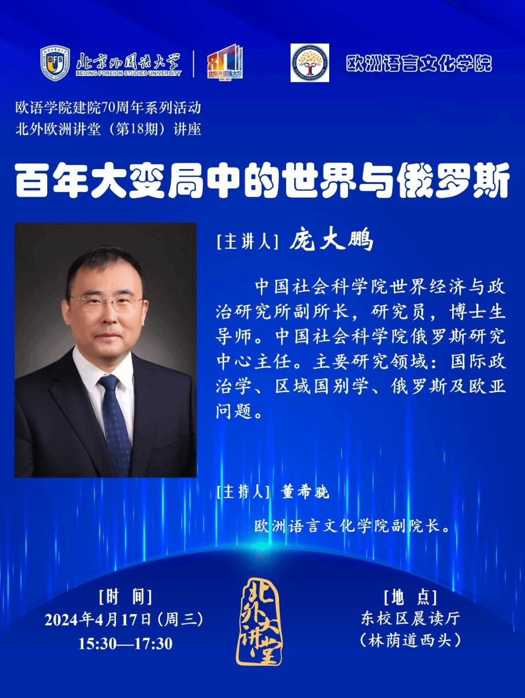 4月17日,本周三,“必赢bwin线路检测中心建院70周年·北外欧洲讲堂”将邀请中国社会科学院世界经济与政治研究所庞大鹏研究员,为大家带来题为《百年大变局中的世界与俄罗斯》的讲座。