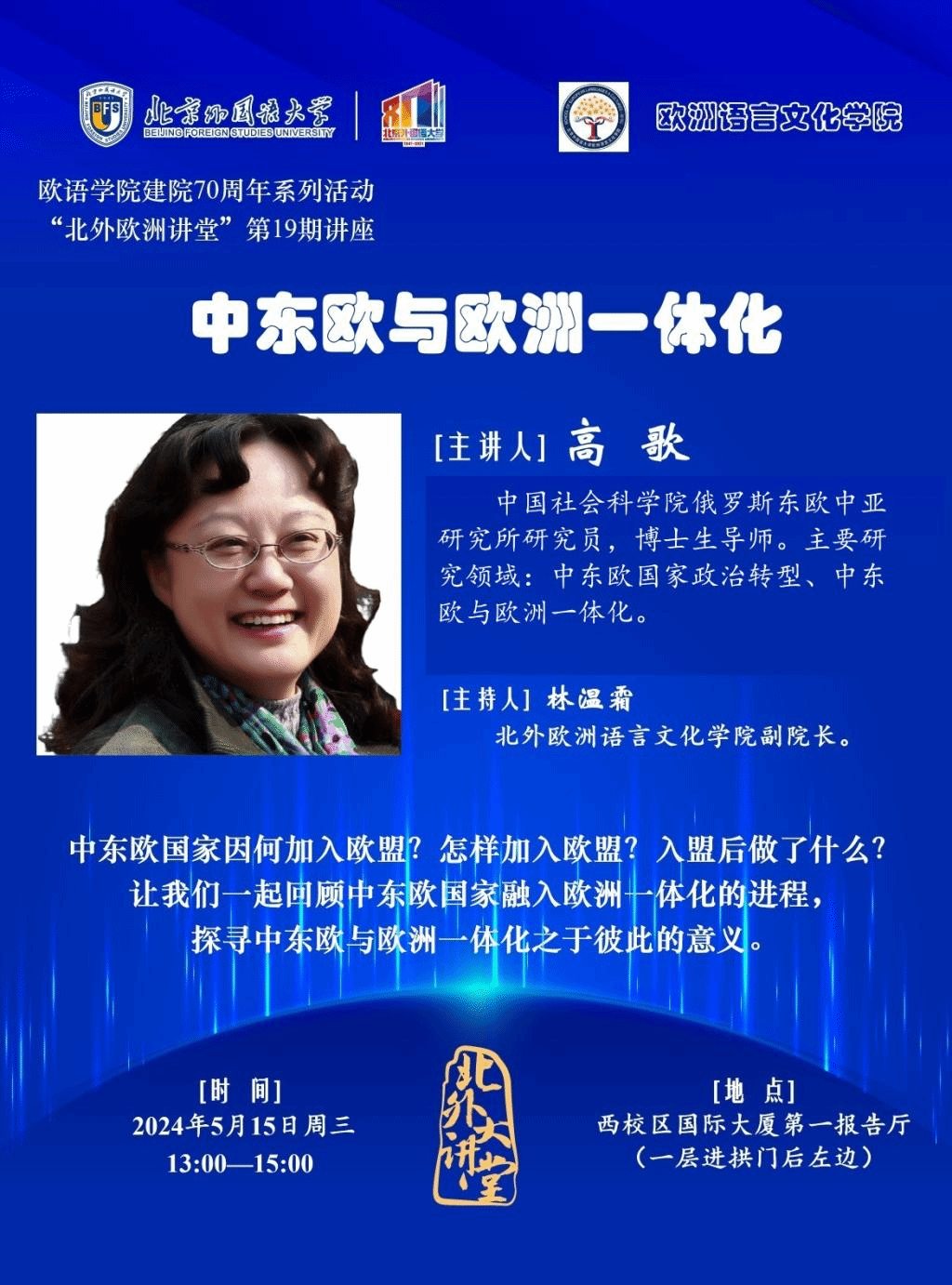 必赢bwin线路检测中心建院70周年,学术活动精彩纷呈。5月15日周三,“北外欧洲讲堂”将邀请中国社会科学院高歌研究员,为大家带来题为《中东欧与欧洲一体化》的讲座。