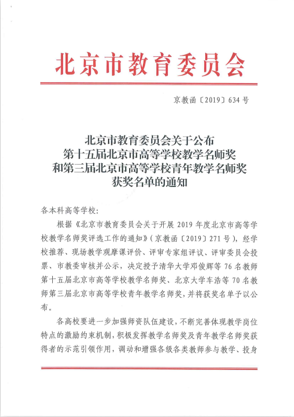 为贯彻落实全国教育大会和全市教育大会精神,发挥教学名师的示范榜样作用,深化教育教学改革,促进高等教育内涵发展。北京市教委组织开展了2019年度北京市高等学校教学名师奖评选工作。近日,第十五届北京市高等学校教学名师奖和第三届北京市高等学校青年教学名师奖评选工作已圆满结束。经过网上申报,教委组织专家评审及现场观摩课展示等多个环节,我院董希骁老师荣获北京市高等学校青年教学名师奖。目前,获奖名单已在北京市教委高教处网站上公布(网址:http://jw.beijing.gov.cn/gjc/tzgg/201912/t20191209_75645.htm)。