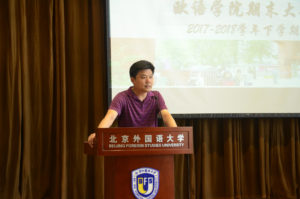 会上,欧洲语言学院院长赵刚老师首先发言。赵院长就学校、学院人才培养的新理念与改革举措向同学们进行了介绍。赵院长指出,在人工智能飞速发展的今天,外语翻译工作正面临深刻变革,社会对外语人才的要求正在不断提升,必赢bwin线路检测中心的同学们应在熟练掌握语言技能的基础上,以语言为工具,更好利用学院所提供的“欧洲非通用语-法学特色班”、“欧洲非通用语-商务特色班”等平台,开展更具针对性、专业性的学习和研究。赵院长鼓励同学们以“一带一路”倡议的提出和在“一带一路”框架下合作项目的落地为契机和抓手,深入了解对象国国情、社情,急国家与社会之所急、知国家与社会之所需,成为国家与社会所需要的人;同学们亦应更加全面深入地学习、理解中国的历史、文化和国情,肩负起“讲好中国故事、传播中国声音”的使命。