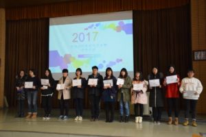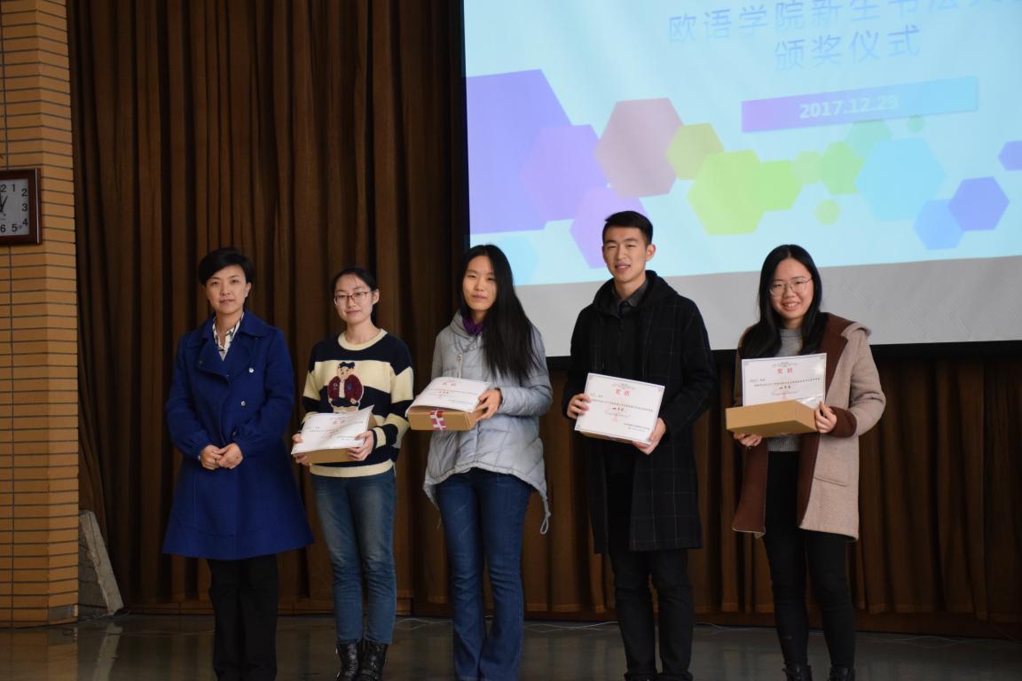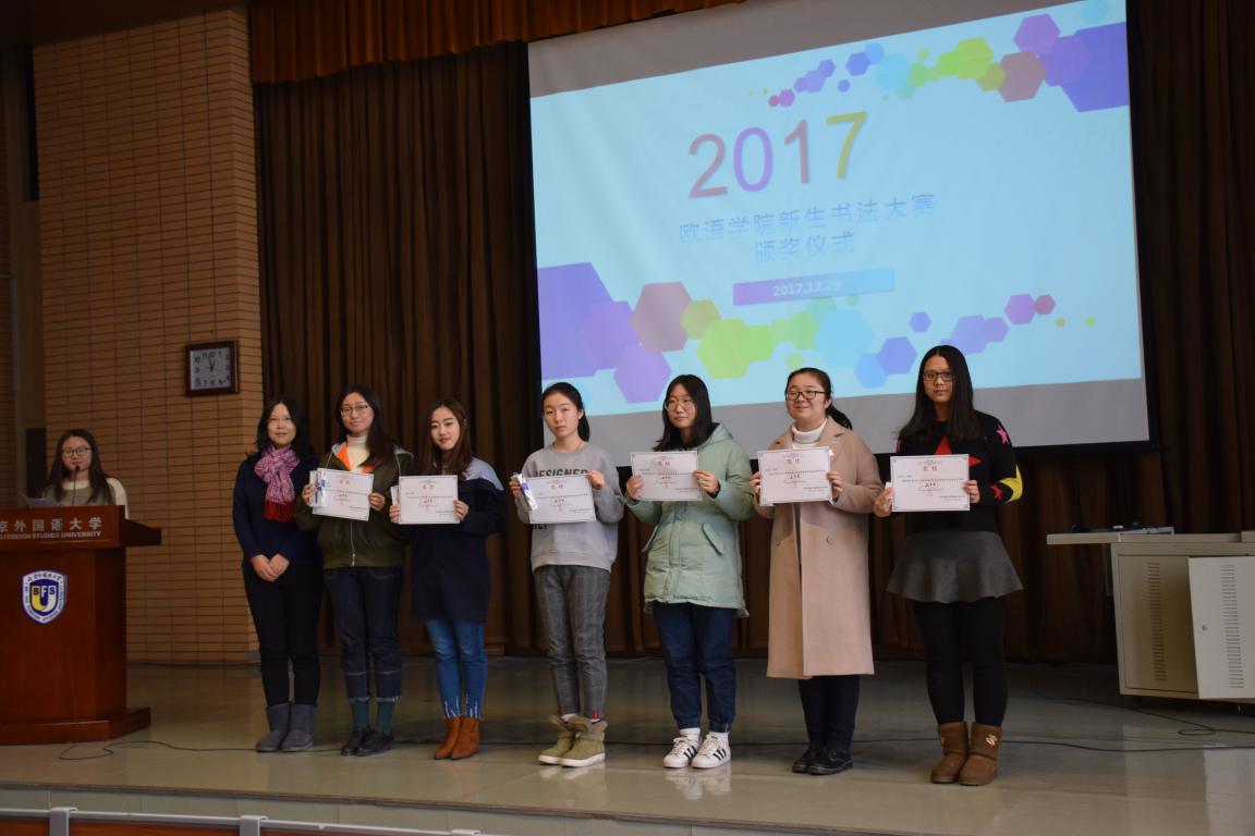 而后举行了全院新生书法大赛颁奖仪式。辅导员陈巧老师依次宣读了三等奖、二等奖、一等奖获奖学生名单,在同学们热烈的掌声中,由董丹老师、杨文老师、林温霜老师为获奖学生颁奖并合影留念。