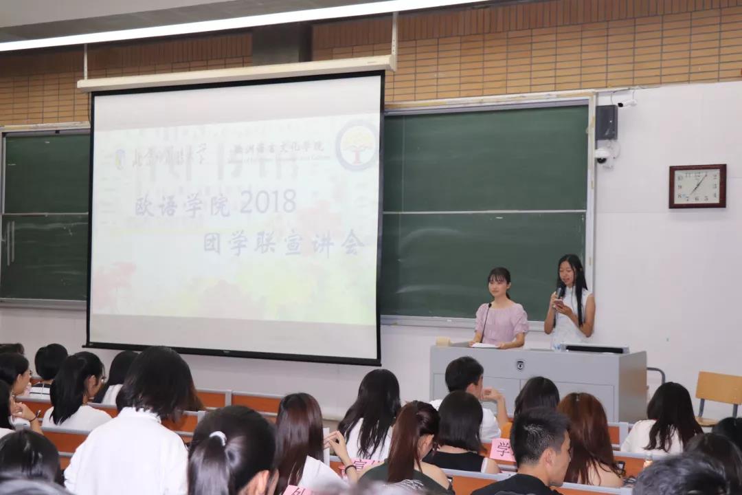欧院团学联分为学生职能部门、艺术团两个部分。宣讲以生活部、体育部、媒体部、学习部、宣传部、文艺部、外联部、舞蹈队、合唱团、北斗、排球队、篮球队、乒乓球队、羽毛球队和足球队的顺序进行,中场休息的十分钟里还安排了艺术团表演。部长、团长们各自带来了精彩的宣讲,为新同学们展示了团学联的风采。