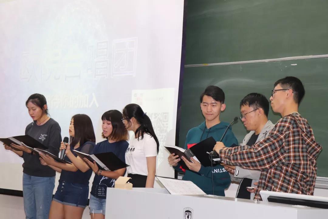 中场休息后艺术团的宣讲便开始了。舞蹈队队长以精彩的招新视频开场,介绍了舞蹈队的辉煌成就和未来计划。合唱团的同学们不仅介绍了合唱团的特色,还带来了两首动听的歌曲表演,在场同学无一不被歌声打动。随后上场的是院刊北斗,作为欧院最大的学生社团,北斗欢迎热爱文字的同学们前来报名。最后,大会以运动队的宣讲结尾,排球队、篮球队、乒乓球队、羽毛球队和足球队分别带来了充满热情、幽默有趣的宣讲,他们对运动的热爱和对集体荣誉的重视感染了所有人,同学们纷纷扫码进入招新群。