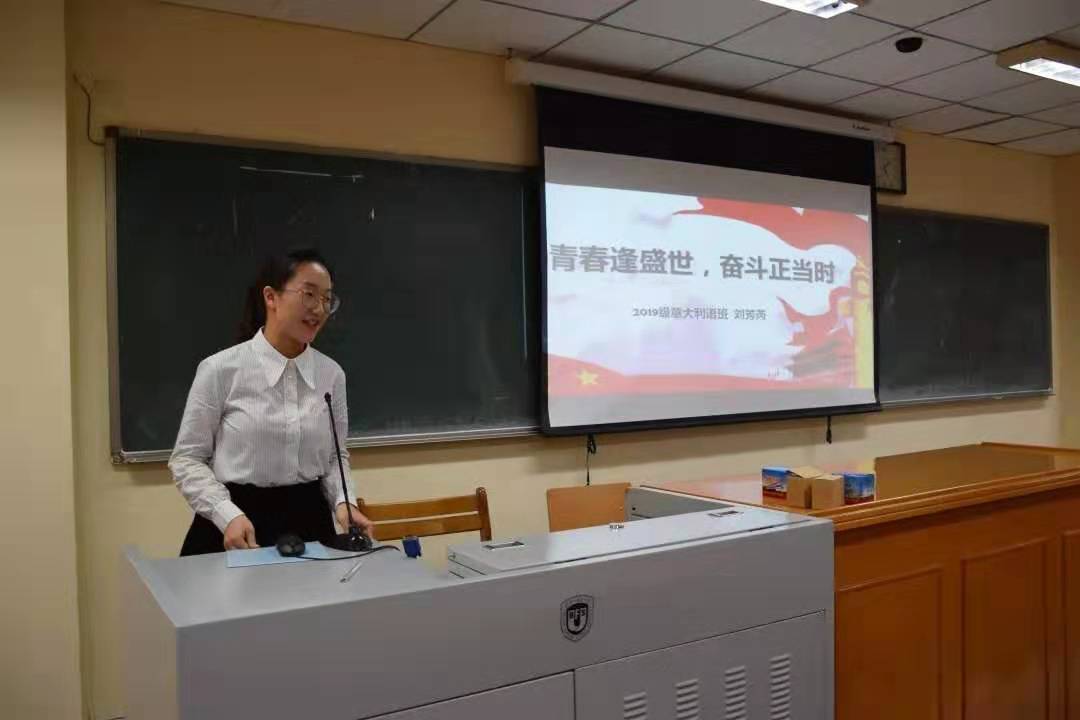 “青春逢盛世,奋斗正当时”,19级意大利语班的刘芳芮用自己坚定的态度,告诉了我们新时代的青年应有的态度:面对成就,莫要懈怠与佛系,而应血气方刚,不畏艰险,披荆斩棘!我们不会忘记前辈们在七十年间留下的汗水,更不会忘记前辈们为祖国的发展做出的巨大牺牲。我们定当砥砺前行 ,以北外人的独特姿态,把世界介绍给中国,把中国介绍给世界!